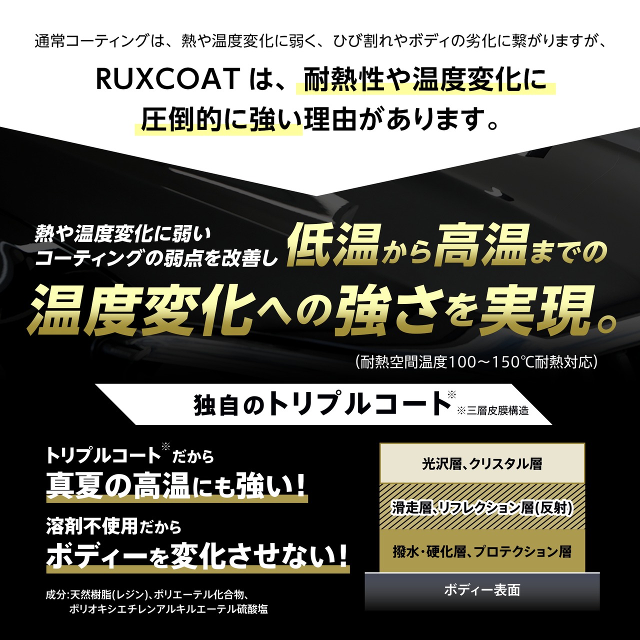 【超撥水&最強耐熱】RUXCOAT(ラックスコート)は、撥水力と耐熱を追求した新素材の天然樹脂(レジン)系コーティングです。